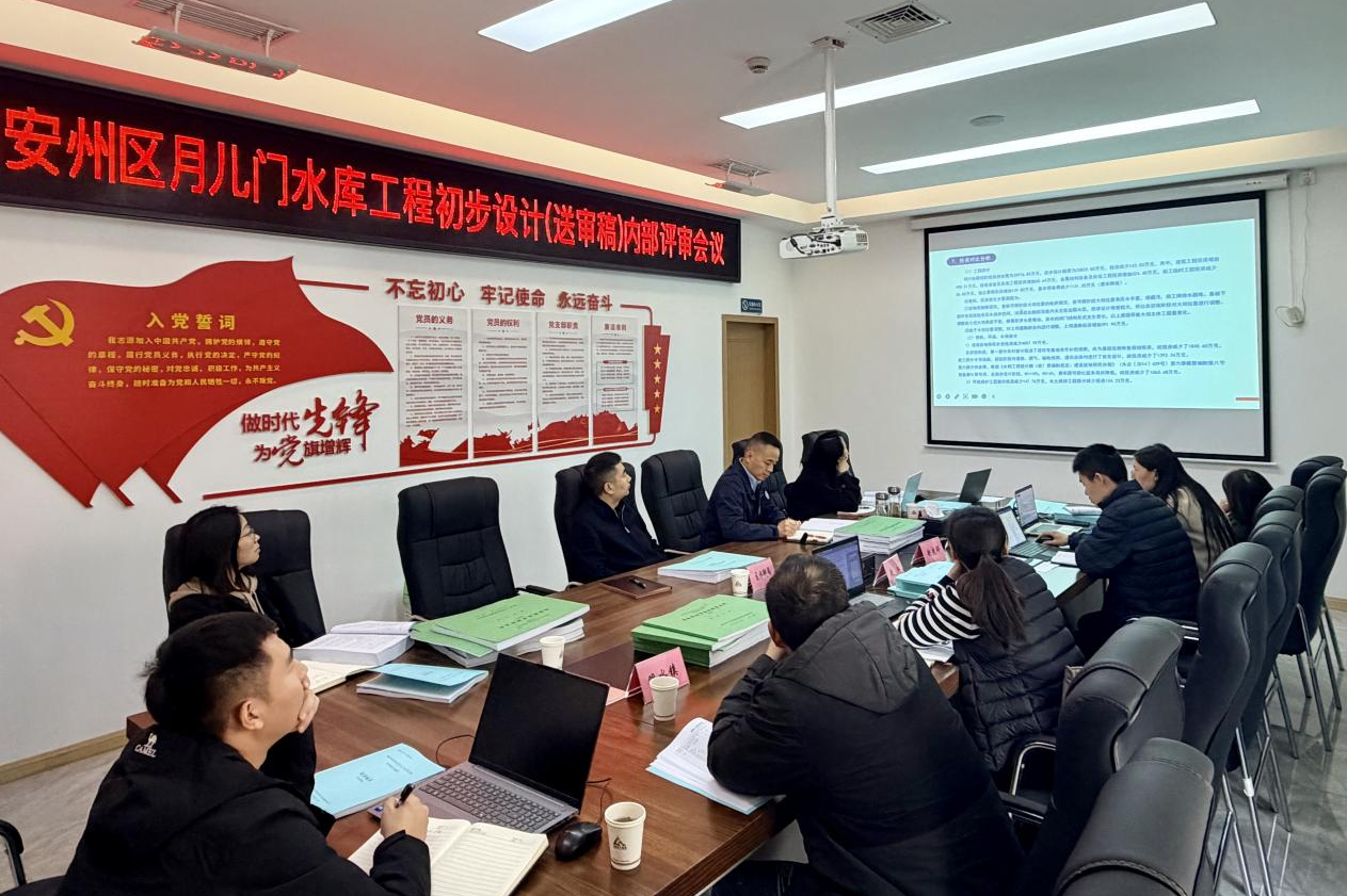 11月10日,集團(tuán)召開(kāi)綿陽(yáng)市安州區(qū)月兒門(mén)水庫(kù)工程初步設(shè)計(jì)(送審稿)內(nèi)部評(píng)審會(huì)議。集團(tuán)董事長(zhǎng)袁波、總經(jīng)理?xiàng)铈面?,市水利?guī)劃設(shè)計(jì)院、區(qū)水利局、雎水鎮(zhèn)政府相關(guān)代表及評(píng)審專(zhuān)家參加。(素材來(lái)源:項(xiàng)目安環(huán)中心 張瑞桃)