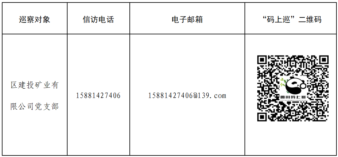 據(jù)悉,區(qū)委第三巡察組將進(jìn)駐區(qū)建投礦業(yè)有限公司開展為期30天的巡察監(jiān)督。巡察期間(5月13日—6月13日)設(shè)專門信訪電話:15881427406,電子郵箱:15881427406@139.com,并在區(qū)建投礦業(yè)有限公司正門保安處(安州區(qū)花荄鎮(zhèn)大北街074號)、區(qū)建投礦業(yè)有限公司一樓子公司辦公點(diǎn)(安州區(qū)花荄鎮(zhèn)大東街005號)設(shè)置了征求意見箱,同步發(fā)布四川“碼上巡”二維碼,并設(shè)有信訪接待點(diǎn)(受理群眾來訪時間為工作日9:00-12:00;14:00-17:00),信訪接訪點(diǎn)地址為:安州區(qū)群眾來訪接待中心(安州區(qū)花荄鎮(zhèn)銀河大道8號)。根據(jù)巡視工作條例規(guī)定,巡察組主要受理反映區(qū)建投礦業(yè)有限公司黨支部領(lǐng)導(dǎo)班子及其成員、下一級機(jī)構(gòu)領(lǐng)導(dǎo)班子主要負(fù)責(zé)人、重要崗位領(lǐng)導(dǎo)干部是否存在違反政治紀(jì)律、組織紀(jì)律、廉潔紀(jì)律、群眾紀(jì)律、工作紀(jì)律和生活紀(jì)律等方面的舉報和反映。其他不屬于巡察受理范圍的信訪問題,將按照分級負(fù)責(zé)、屬地管理原則,轉(zhuǎn)交有關(guān)單位辦理。