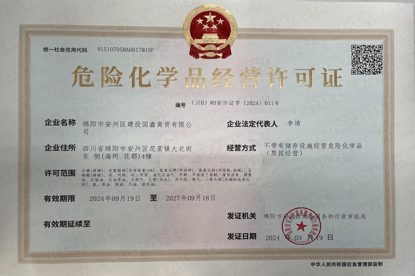 近日,綿陽安州礦產(chǎn)資源集團有限公司全資子公司綿陽市安州區(qū)建投國鑫商貿(mào)有限公司(以下簡稱“國鑫商貿(mào)”)順利取得《危險化學(xué)品經(jīng)營許可證》。